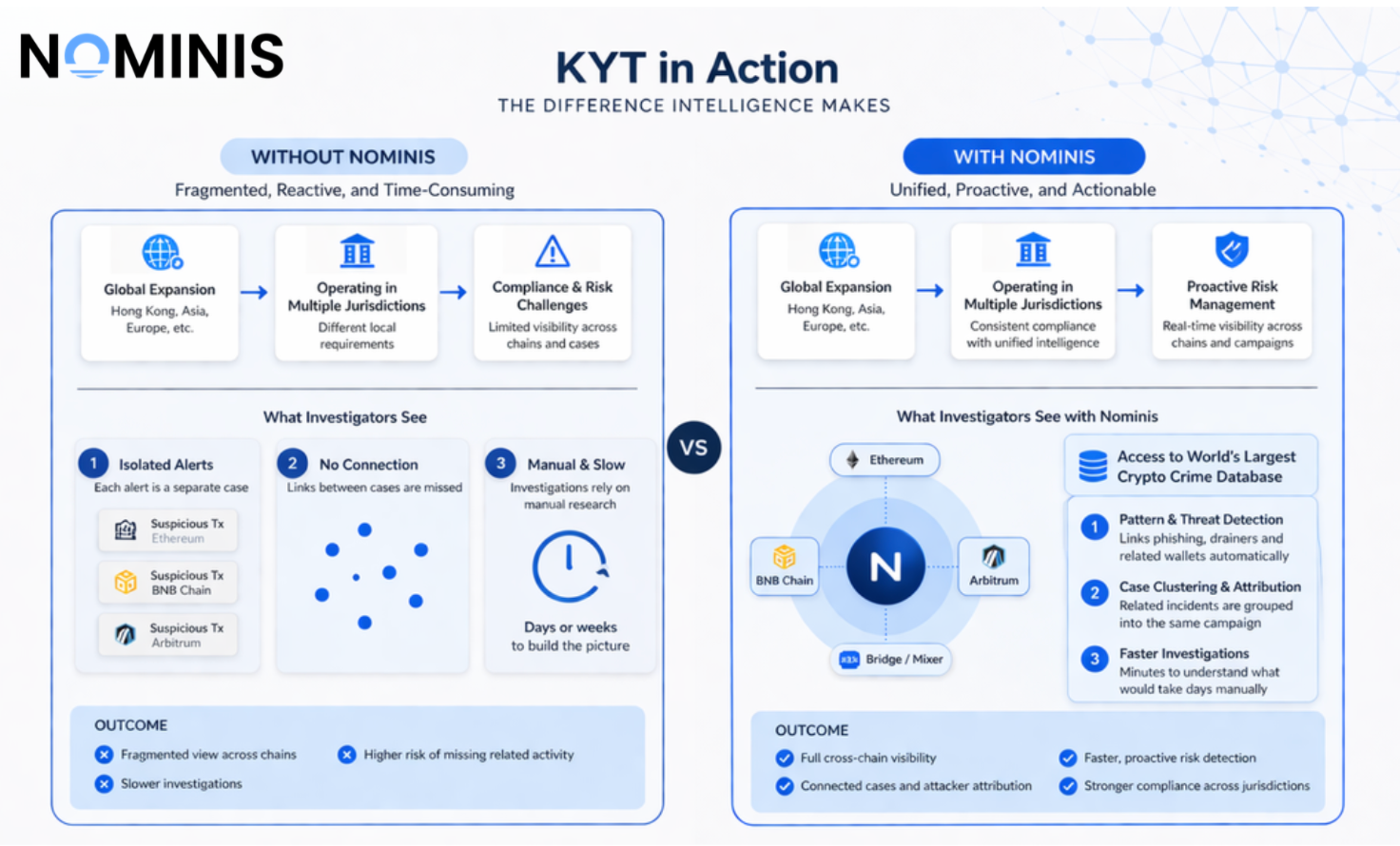 Modern financial crime is rarely made up of single, isolated transactions. Phishing campaigns, wallet drainers, and mule networks often involve groups of wallets, repeated behaviours, and shared infrastructure. When alerts are treated individually, these patterns are easy to miss, or take too long to uncover. NOMINIS addresses this through clustering and entity-level analysis, linking related wallets, transactions, and behaviours into a single view. This allows teams to move beyond isolated alerts and understand activity as part of a broader pattern, making detection faster and investigations more efficient.