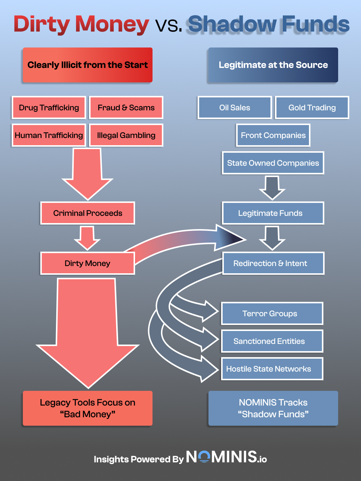However, NOMINIS is increasingly recognizing that modern terror financing and hostile state funding frequently do not begin as criminal proceeds. They often originate from entirely legitimate activities: oil sales, gold trading, state-linked enterprises, front companies, or even charitable donations. The funds themselves are not inherently illegal at origin, but the risk emerges later, when those funds are strategically redirected to sanctioned groups, terror organisations, or hostile state networks.