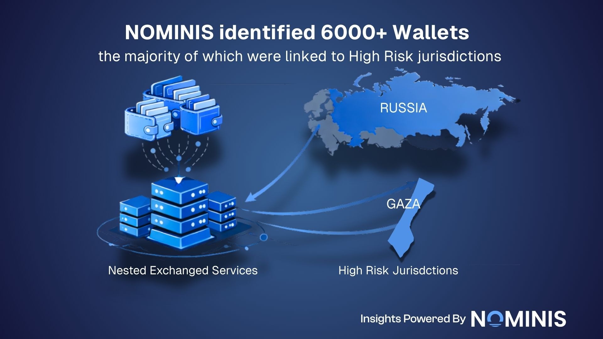 NOMINIS has identified nearly 6,000 wallets linked to nested exchange services, the majority of which were based in high risk jurisdictions including Russia and Gaza, collectively facilitating over $100 million in transaction volume annually, underscoring the scale at which this structure operates.
