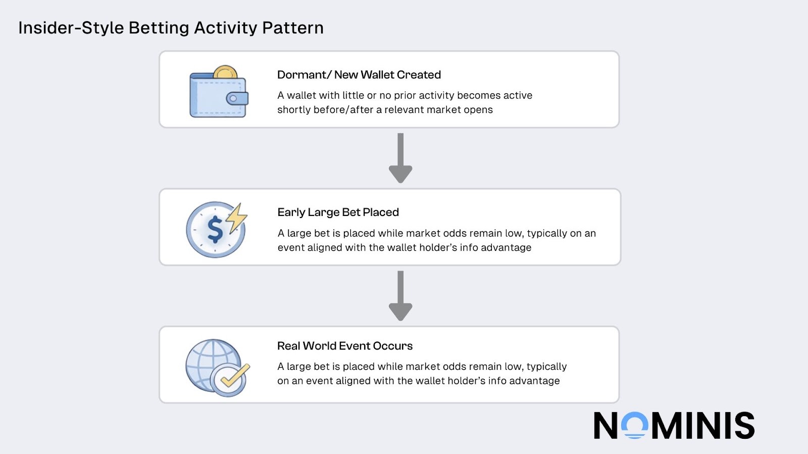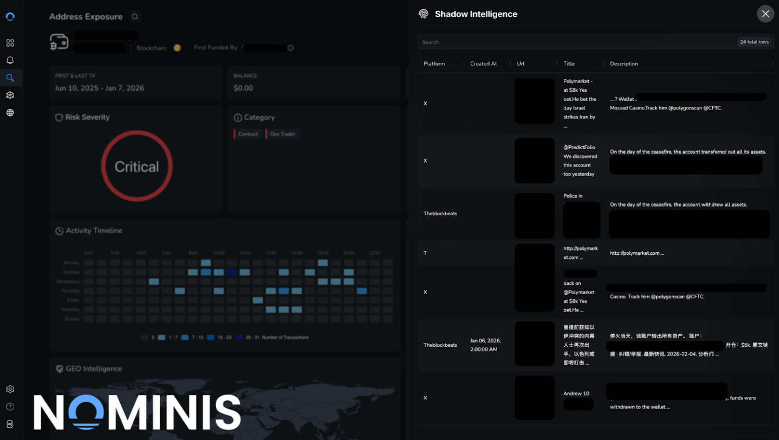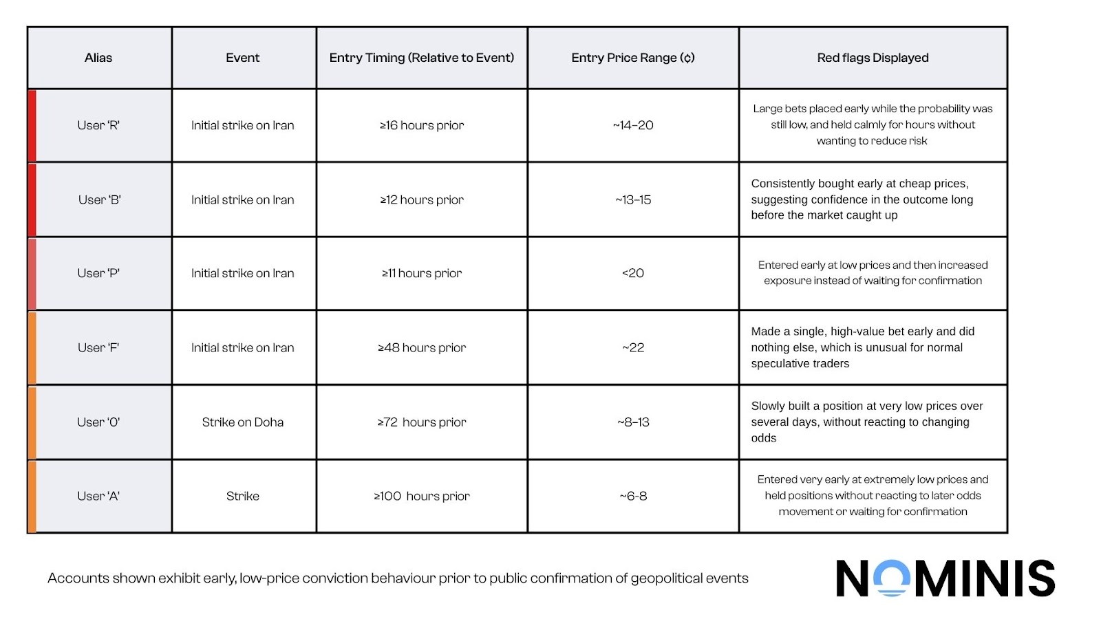 To assess risk, NOMINIS examined entry timing, price tolerance, position size, patience, and repetition across events. On-chain activity was contextualized using the NOMINIS intelligence database, including wallet funding patterns, wallet reuse, and historical behavior across unrelated geopolitical markets. No single trade was treated as conclusive. Suspicion was assessed through convergence of indicators.