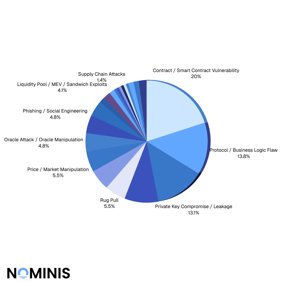 Followed by protocol logic flaws and business logic errors. These incidents often stemmed from unsafe assumptions, improper validation, flawed upgrade paths, or incomplete permissioning models.