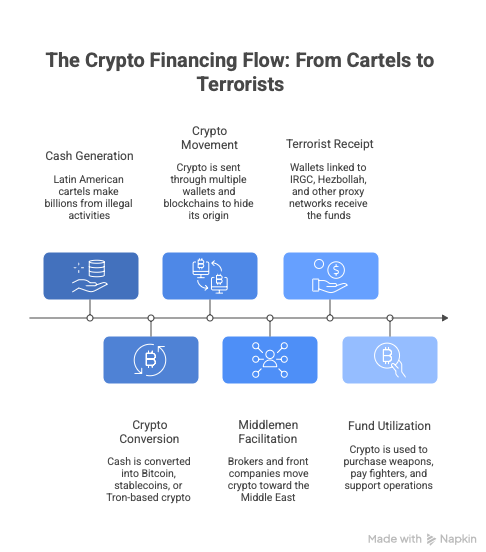 For Hezbollah and the IRGC, cryptocurrency functions as a sanctions-bypass mechanism at state-aligned scale. The cross-regional pipeline linking Hezbollah financial networks to Latin American drug cartels, documented through wallet clustering and transaction-flow analysis, illustrates how terrorist organizations and profit-driven criminal syndicates now collaborate operationally, using digital assets as the connective infrastructure. IRGC oil-revenue laundering, conducted through wallets processing hundreds of millions of dollars and converting proceeds into high-liquidity stablecoins, demonstrates how digitized commodity revenues can sustain proxy warfare, procurement networks, and regional destabilization efforts without reliance on formal banking channels.