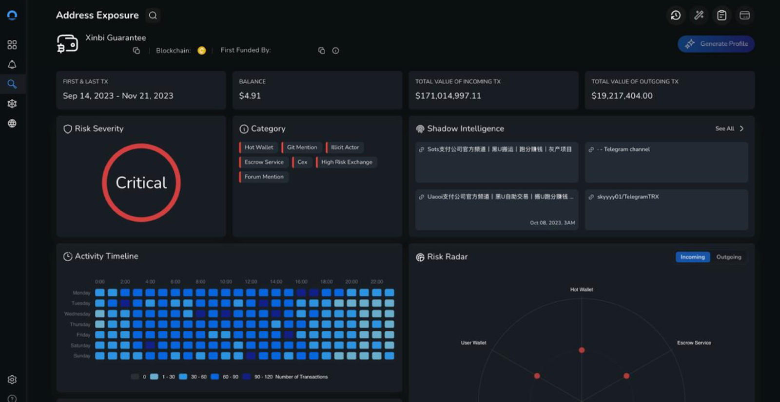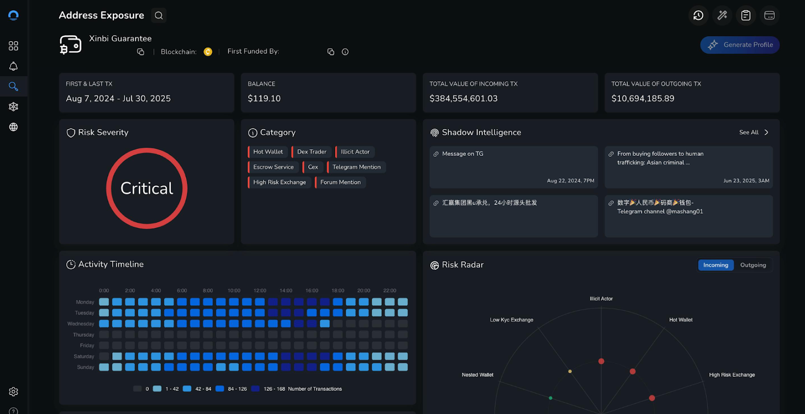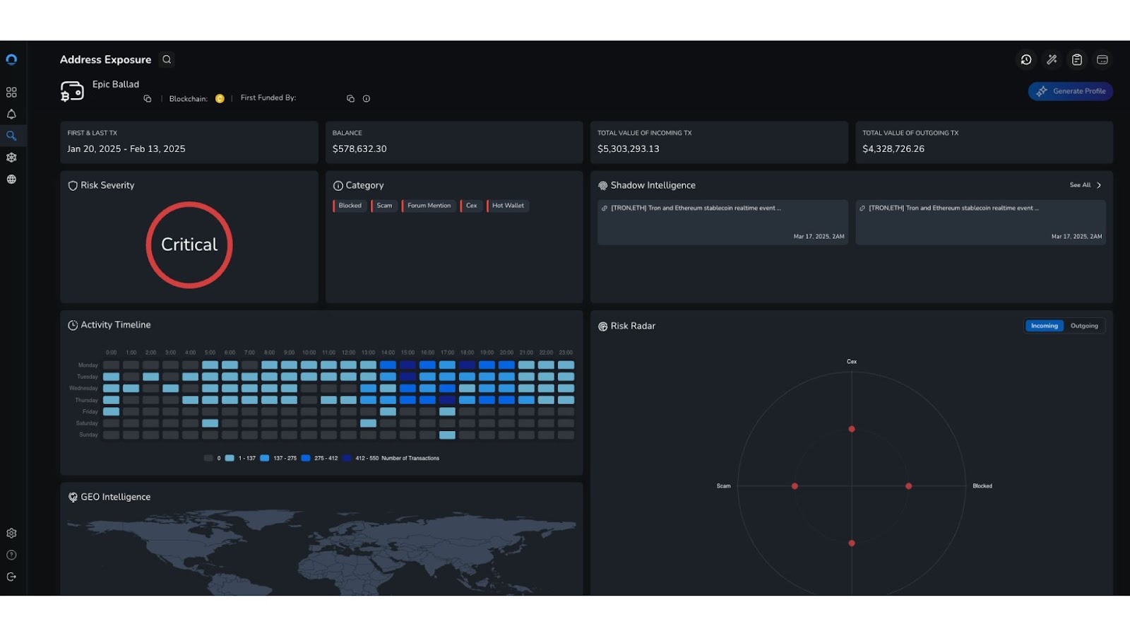 Example of an Epic Ballad wallet, as screened using the NOMINIS platform, to recognise the critical-level risk score. This wallet in particular has seen millions of dollars in cryptocurrency moving both in and out