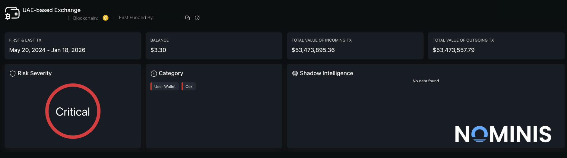 Through structured on-chain analysis, NOMINIS identified approximately $11 million in inflows into a UAE-based exchange wallet referred to as Wallet TFod.
