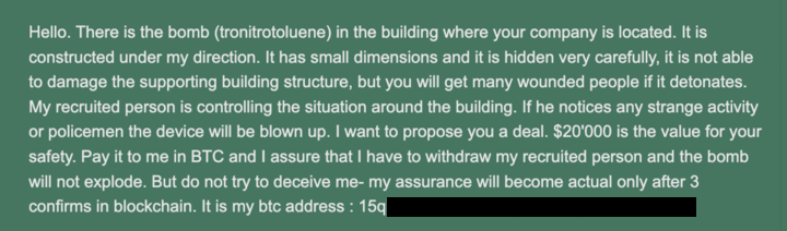 Last night, multiple Jewish institutions in the United States received anonymous bomb threat emails demanding payment in Bitcoin. A threat sent to a synagogue closely mirrors a well-documented pattern of bogus bomb threats that appears to first start in 2018. These campaigns are characterized by near-identical wording, recycled intimidation tactics, and critically, the reuse of Bitcoin wallets that have previously appeared in hoax threat emails.