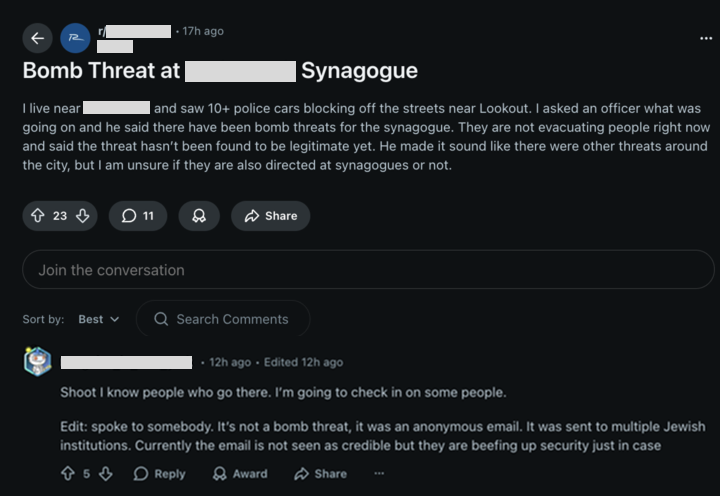 Roughly seventeen hours after the Temple Chai incident became known, reports emerged describing a similar anonymous email sent to a second synagogue prompting a significant police presence. According to Reddit Users, authorities indicated that the message had been distributed to multiple Jewish institutions and was not initially considered credible, though security was increased as a precaution.